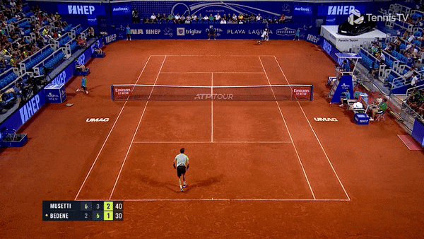При счете 1:2, 30:40 в третьем сете Бедене не попал первой подачей. Музетти отправил мяч обратно на его половину корта, и словенец от него отмахнулся. Мяч в итоге улетел на трибуны и попал в одну из сидевших там девушек.