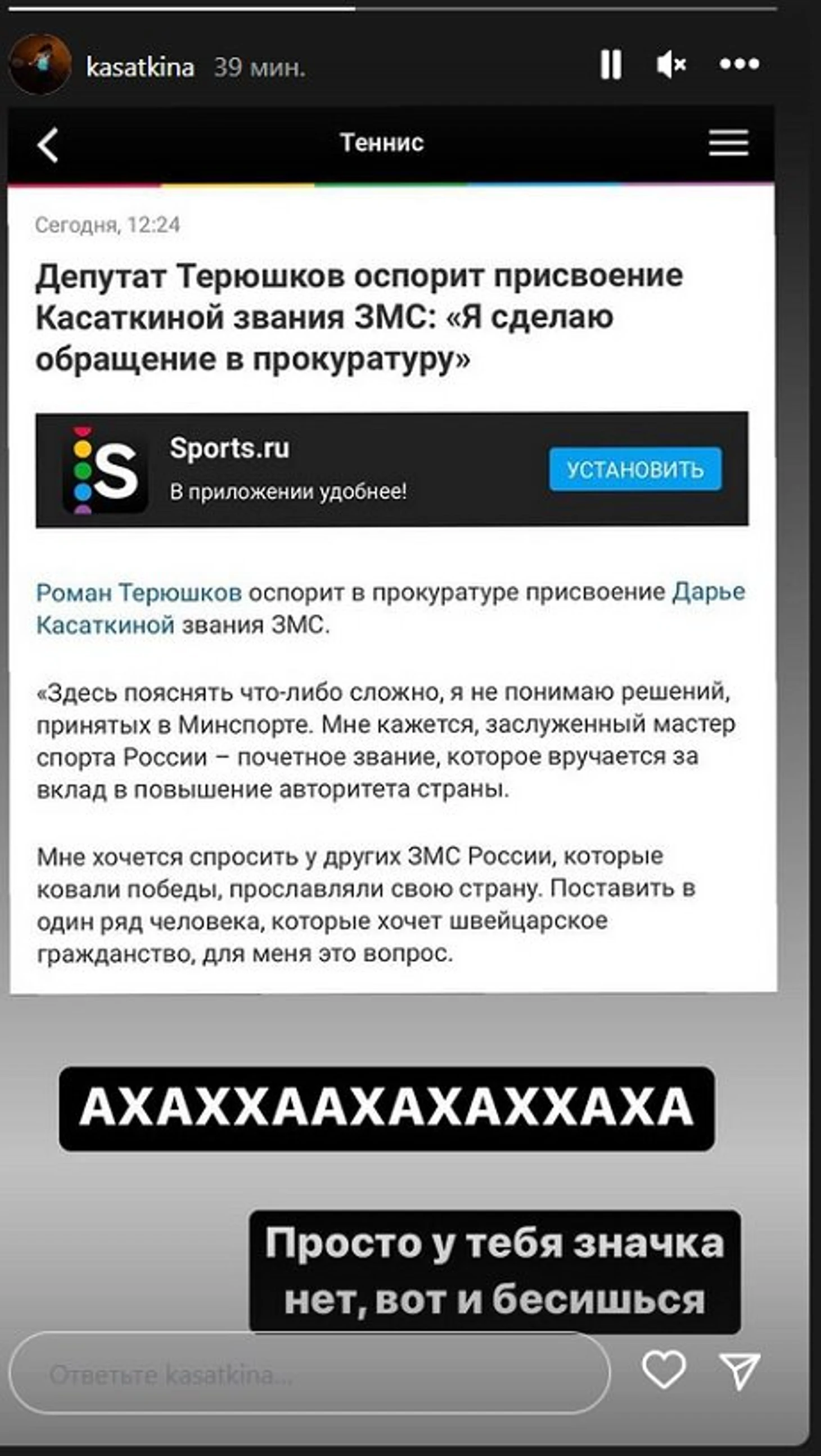 Просто у тебя значка [ЗМС] нет, вот и бесишься», – написала Касаткина в сторис инстаграма, приложив скриншот новости Sports.ru.