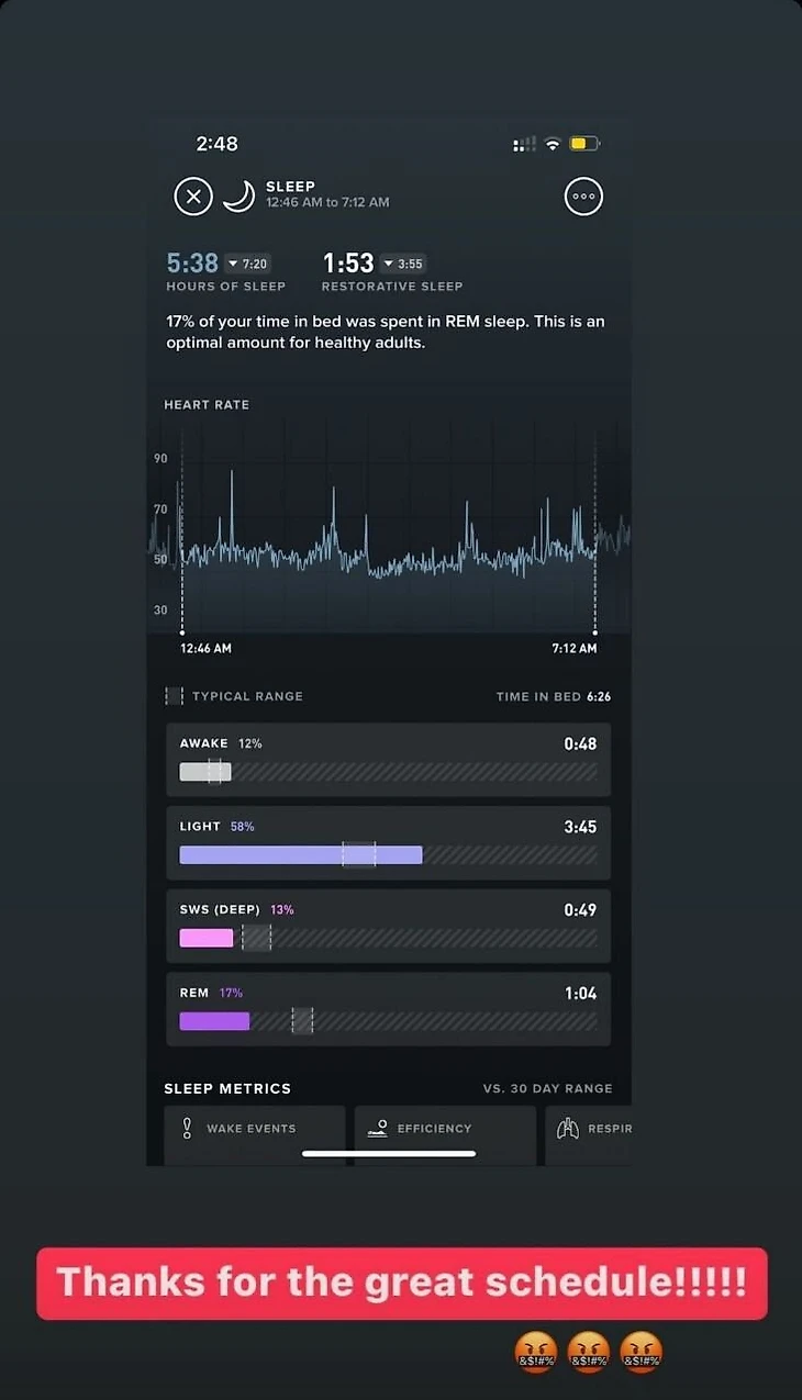 «Спасибо за классное расписание!!!!! 🤬🤬🤬», – написала Соболенко, прикрепив скриншот из приложения для отслеживания сна.