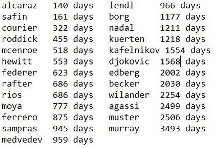 Меньше всего времени понадобилось действующему лидеру рейтинга Карлосу Алькарасу (140 дней), больше всего – Маррею (3493 дня).