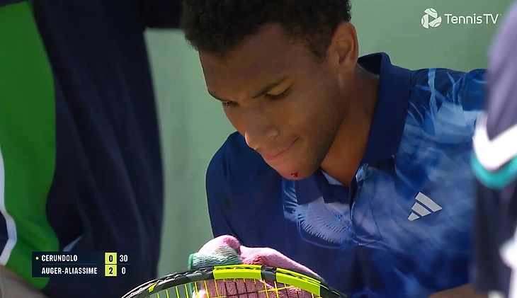 Феликс Оже-Альяссим разбил себе подбородок ракеткой в матче против Франсиско Серундоло в Индиан-Уэллс.