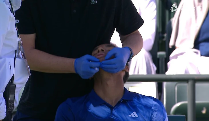 На корт пришлось вызвать физио, который обработал рассечение специальным клеем. Оже-Альяссим объяснил ему, что неудачно попал по мячу на приеме.