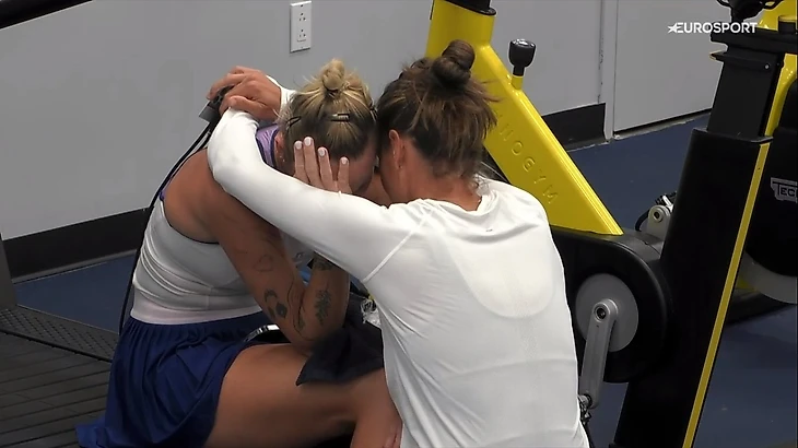 «Евроспорт» показал, как после матча она сидела в подтрибунном помещении с холодным компрессом на левой руке. По ходу матча с Пейтон Стернс она вызывала врача из-за проблем с плечом.