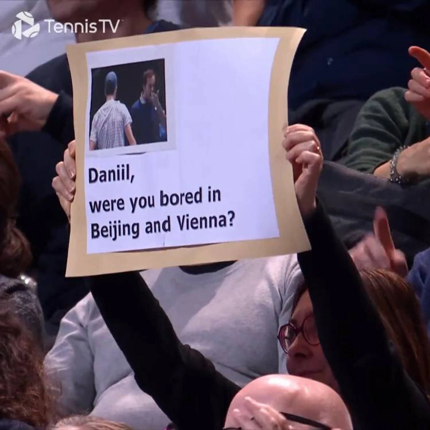 Она пришла на матч Медведева против Александра Зверева на итоговом турнире с плакатом «Даниил, тебе было скучно в Пекине и Вене?».