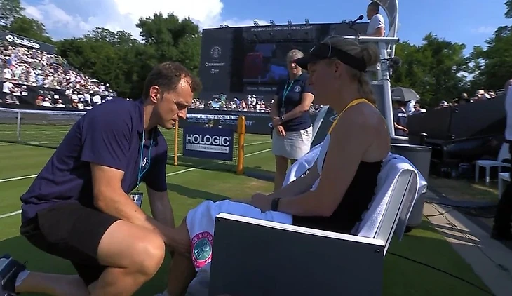 Датчанка упала, ведя 5:3 в первом сете. Ей понадобился медицинский перерыв из-за проблем с левым коленом.