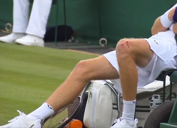 Андрей Рублев разбил колено ракеткой в первом круге «Уимблдона» против Франсиско Комесаньи (4:6, 7:5, 1:4, матч прерван из-за дождя).