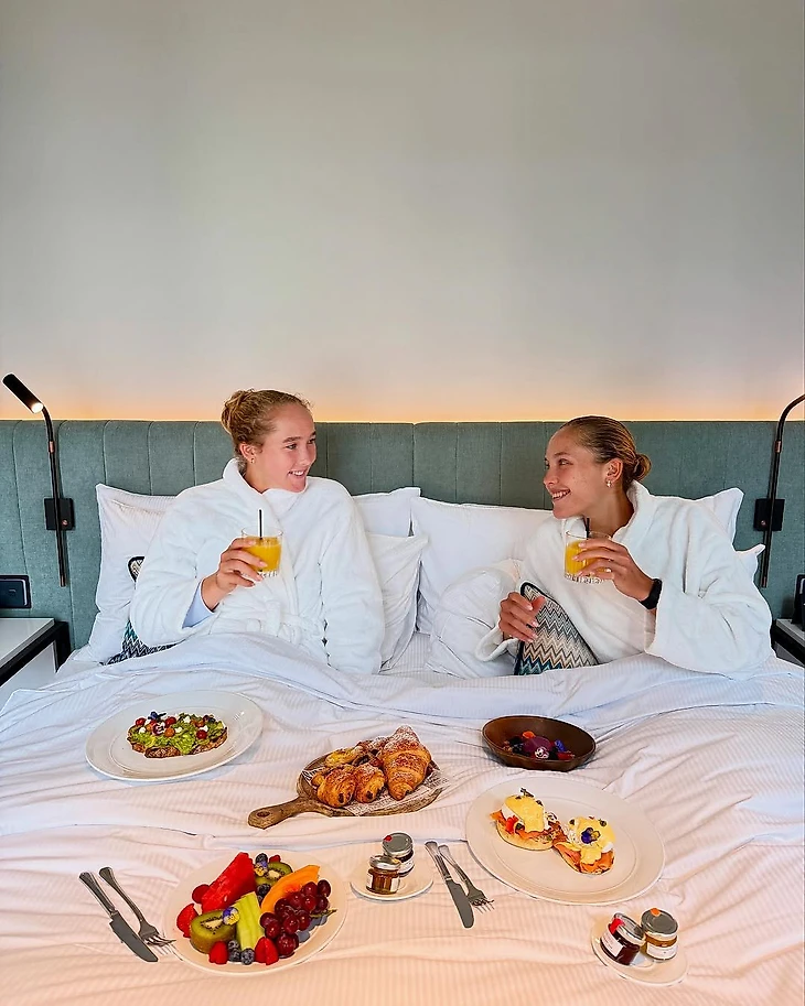 Сестры Андреевы поделились совместным постом с отелем Hilton в Мельбурне, под которым написано: «Подаем завтрак как профессионалы».