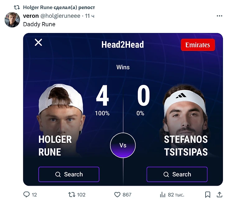 Руне выиграл у Циципаса четыре раза. После вчерашнего матча в Индиан-Уэллс (6:4, 6:4) датчанин репостнул много фото и видео, а также твит, где он назван «папочкой Руне».