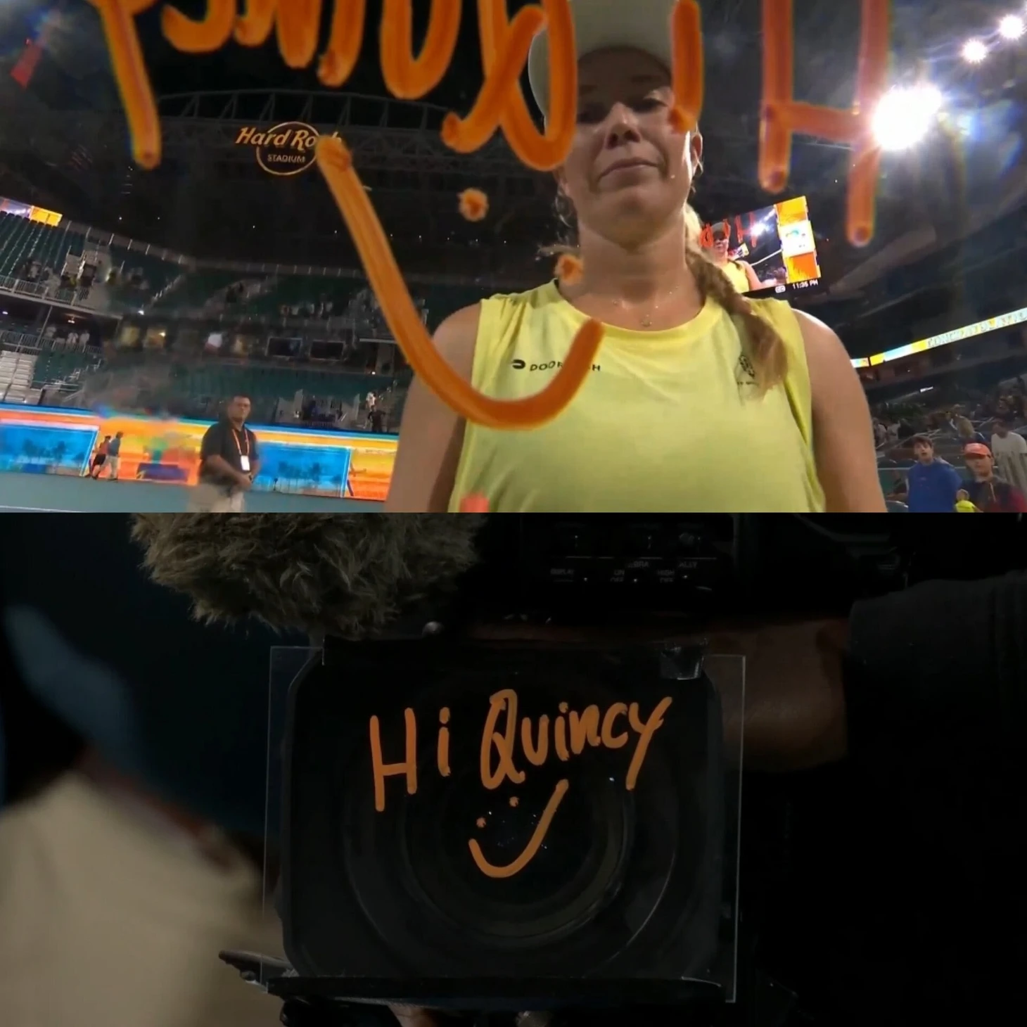 Коллинс после выхода в 3-й круг в Майами посвятила надпись на камере собаке: «Привет, Квинси :)»