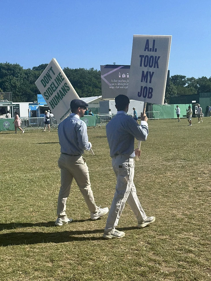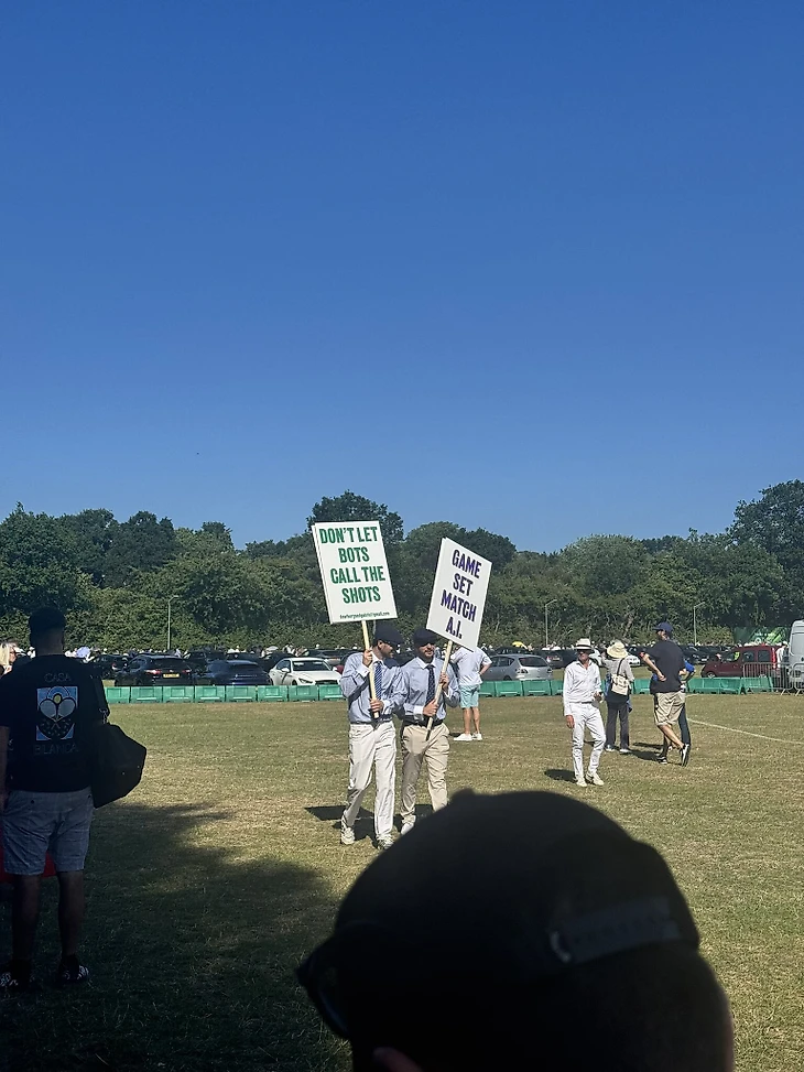 Два человека в форме линейных судей ходят с транспарантами, на которых написано: «Искусственный интеллект отобрал у меня работу», «Не позволяйте машинам решать удары», «Гейм, сет, матч, искусственный интеллект», «Не отодвигайте людей на задний план».