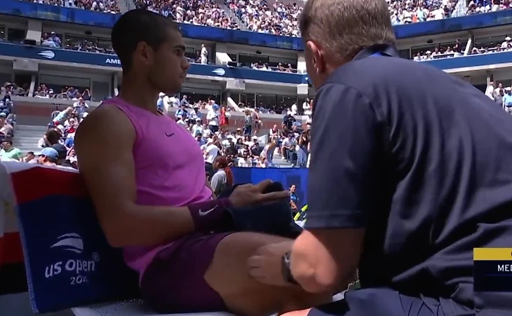 При счете 6:2, 5:4 Алькарас взял медицинский перерыв и попросил судью вызвать на корт физиотерапевта. Он сообщил, что почувствовал дискомфорт в правом колене во время одной из подач.