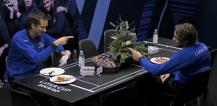 В ответ на публикацию Стефанос выложил фото с Кубка Лэйвера, где он и Медведев сидят друг напротив друга, с подписью: «Прямая трансляция со стола B».