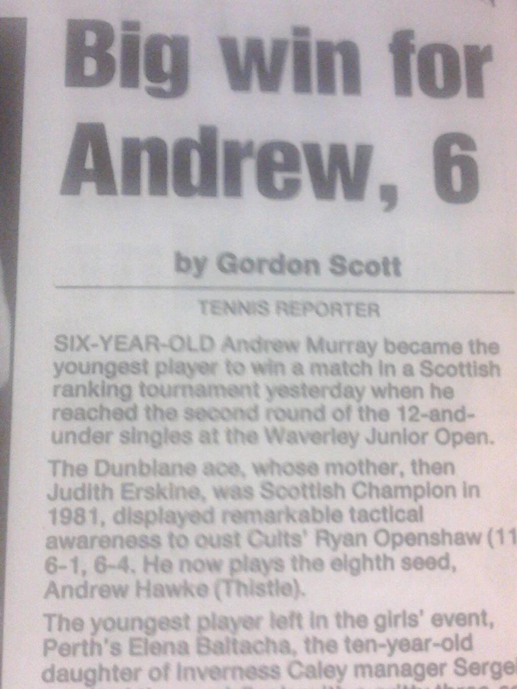 Джуди Маррей тем временем вспоминала в твиттере первые победы сына, в 6 лет обыгравшего некоего 12-летнего Эндрю Хока на турнире в Шотландии. А репортёр Горден Скотт, написавший эту самую заметку, вспоминает о том дне, когда он впервые увидел в деле будущего лучшего теннисиста мира.