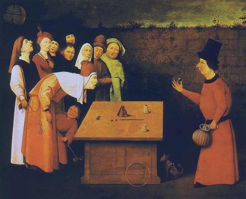 Вчера мне попала на глаза картина Иеронима Босха "Фокусник", и помедитировав на нее, я поняла, что в финале ЮСО победит Рафа! Вот примерно таким он будет в старости. Вместе с дрессированной собачкой, которая станет его верным товарищем, Рафа обойдет всю Испанию, а так же сопредельные страны, показывая теннисные и всякие другие фокусы, не брезгуя и наперстками)