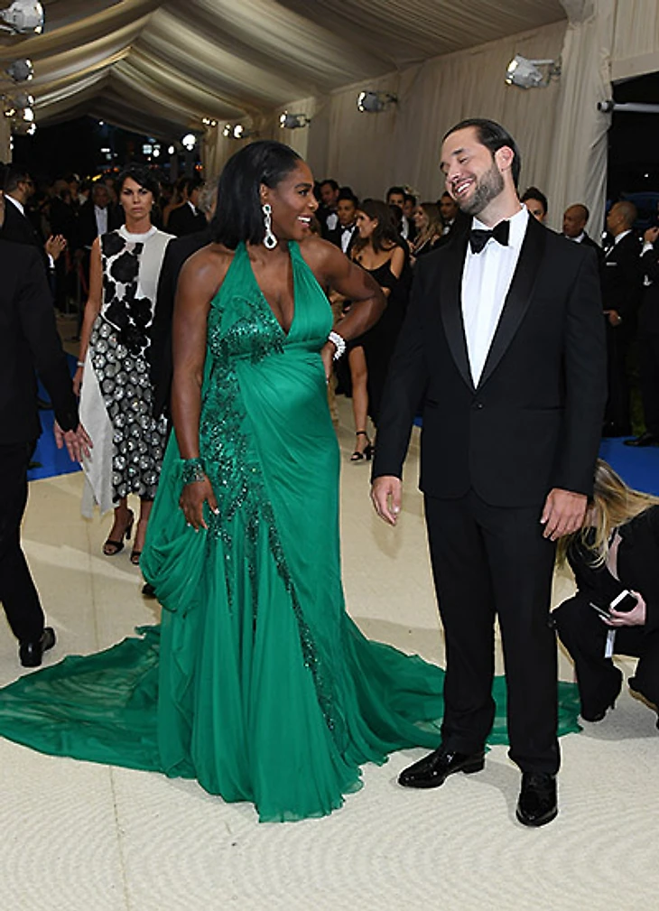 Чемпионы последнего Australian Open пришли на бал в сопровождении своих вторых половин: Серена в изумрудном платье Versace с Алексисом Оганяном, от которого ждет ребенка, а Роджер в безумном Gucci – конечно, с Мирославой.