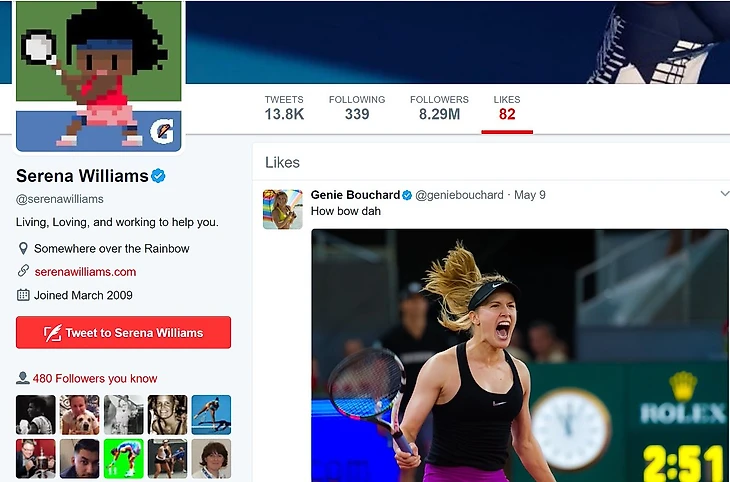 После победы над Шараповой в Мадриде Бушар выложила триумфальную фотографию с подписью: «How bow dah». (Это отсылка к отвратительному недомему, в котором юная гопница на одном из американских ток-шоу с гетто-акцентом предлагала подраться кому-то из зрителей. Закончила свою речь она как раз этой фразой – «How bow dah», что в нормальном исполнении звучало бы как «How about that» и переводилось бы примерно «Ну как вам такой вариант?»). Вскоре после этого Серена ко всеобщему восторгу лайкнула этот твит.
