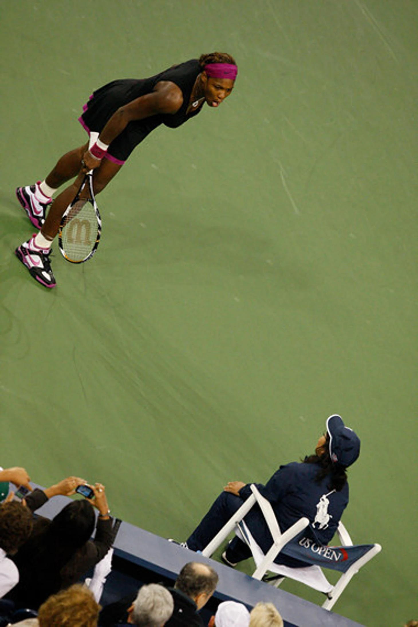 Серена Уильямс рассказывает судье на линии, что сейчас «затолкает мяч ей в глотку»