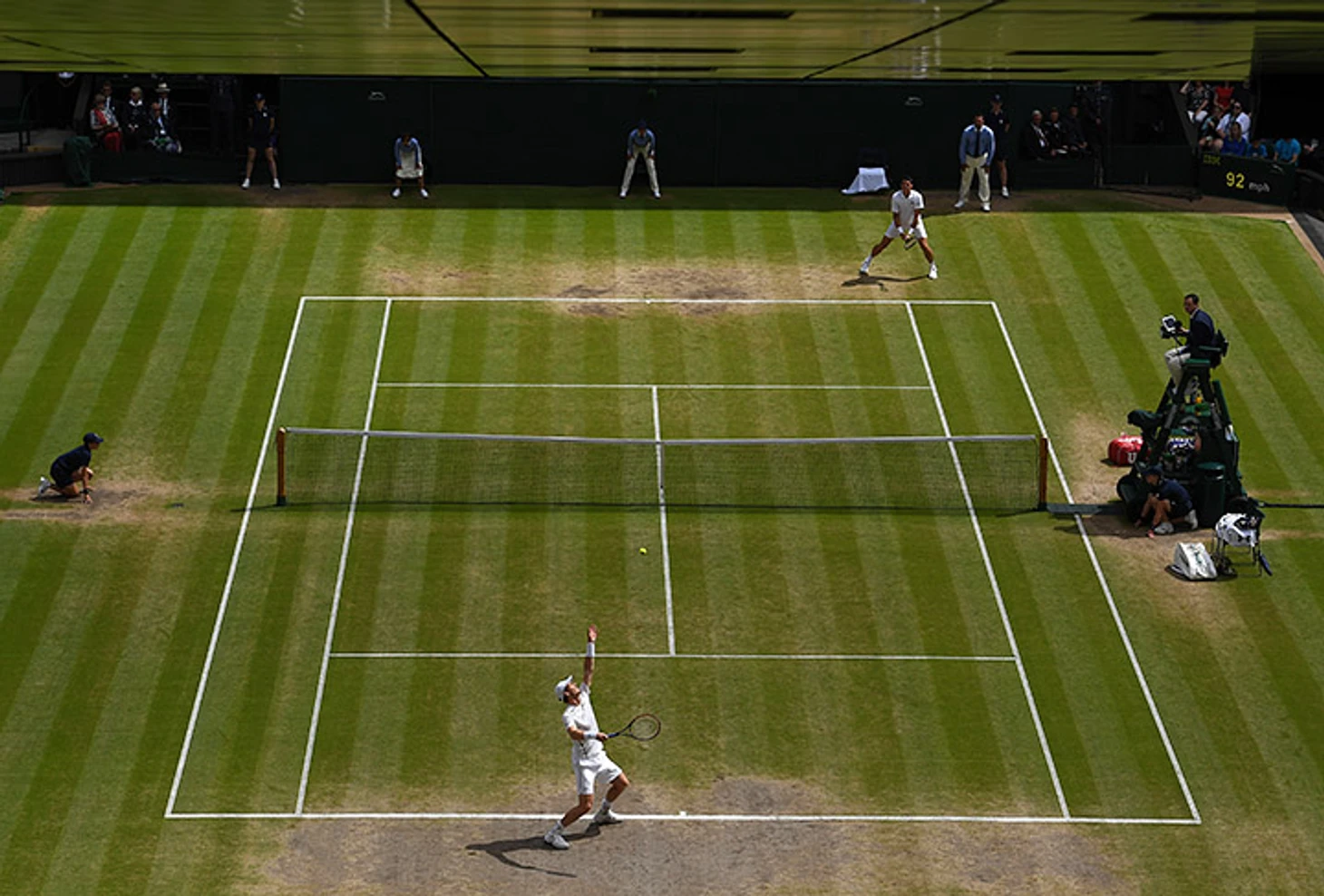 Прошлогодний финал «Уимблдона» между Энди Марреем и Милошем Раоничем. Раньше на «Уимблдоне» к финалу на корте была протоптана тропинка к сетке