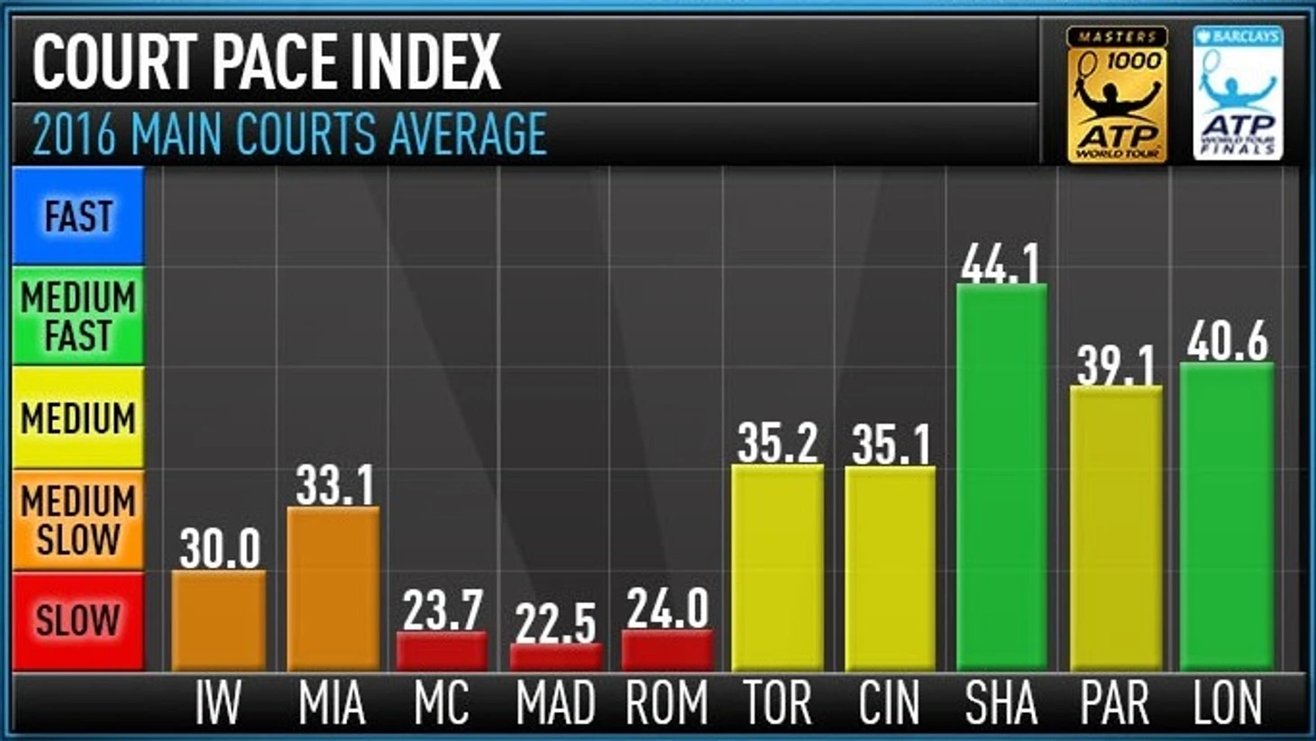 Сравнение скорости кортов на основных мужских турнирах в 2016 году: «Мастерсах» и итоговом турнире в Лондоне (на семи из них играют и женщины). Быстрых кортов не осталось вовсе, и только на трех турнирах корты дотягивают до средней скорости