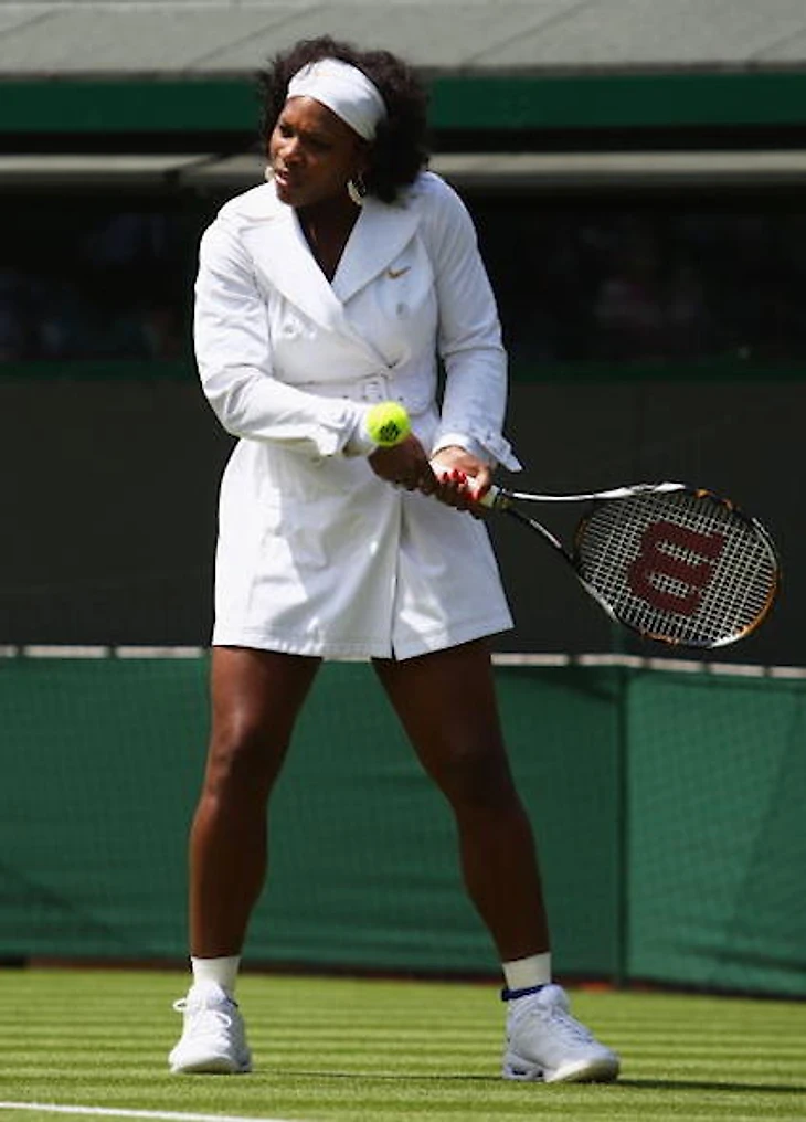 У Серены Уильямс было немало ярких уимблдонских нарядов, но вряд ли что-то сравнится с классическим тренчем, в котором она выходила на матчи в 2008-м.