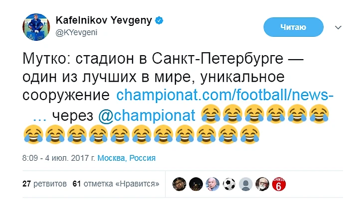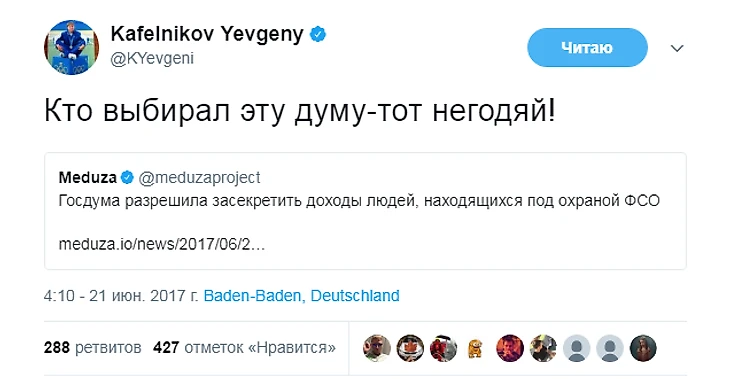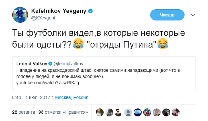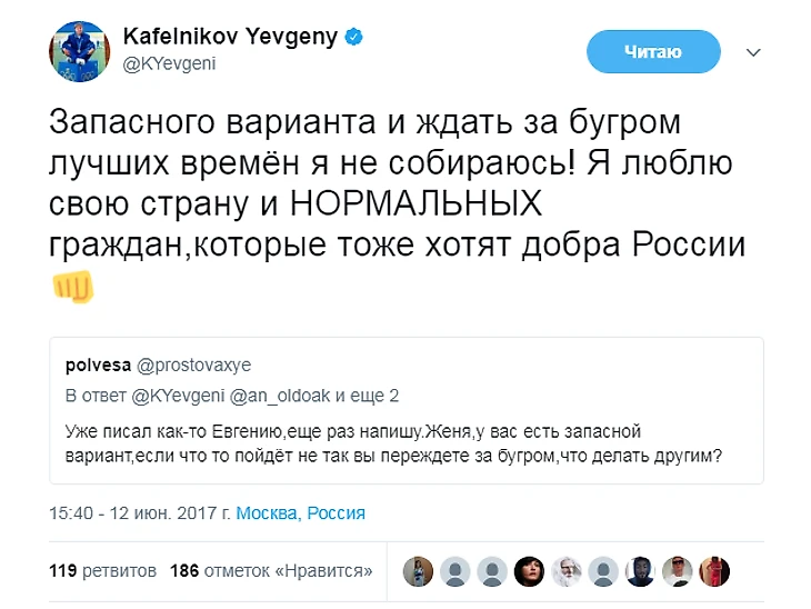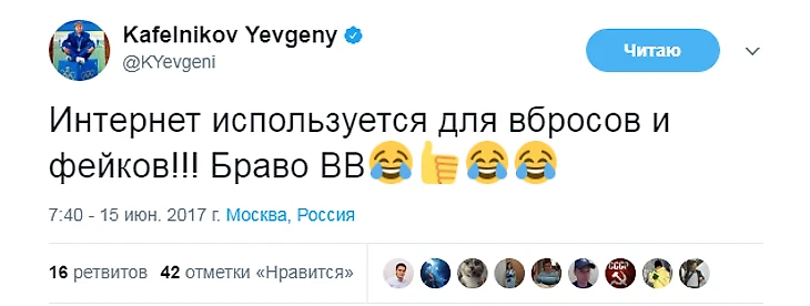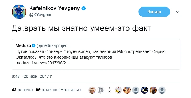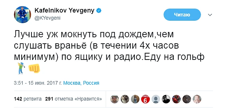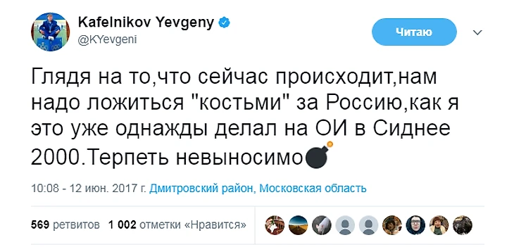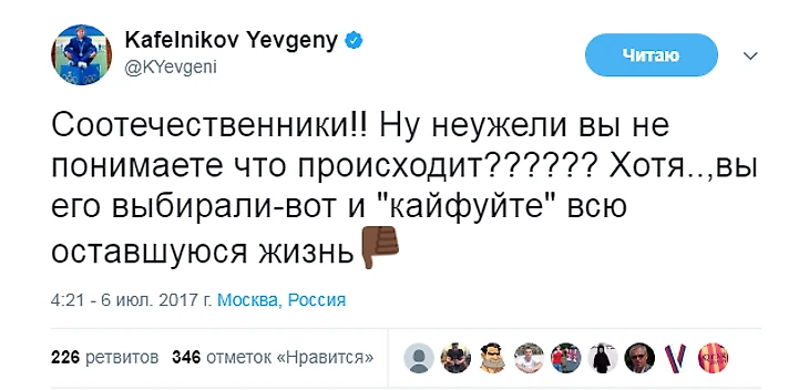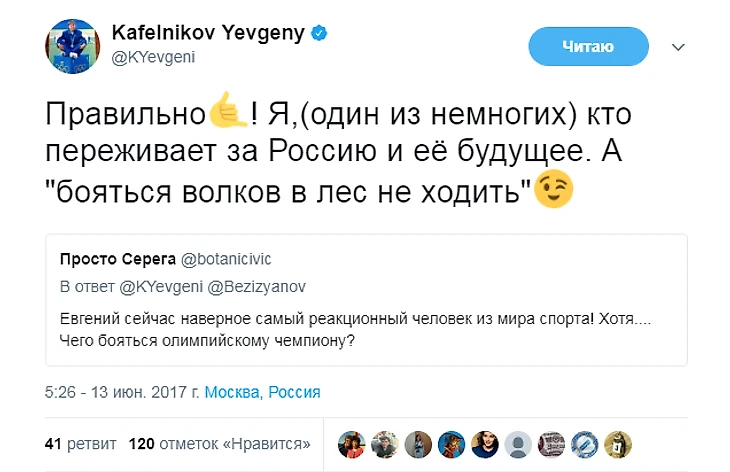 С тех пор Кафельников не только не стал осторожнее в высказываниях, но и повысил их градус. Ниже – политические твиты Кафельникова за последние пару месяцев.