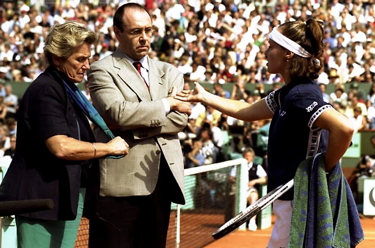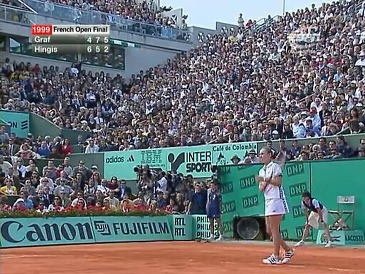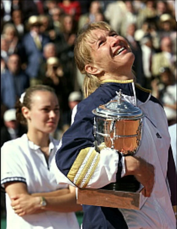1999 год. Открытый  чемпионат Франции.  Штеффи в четвертьфинале и полуфинале,  в упорной борьбе поочерёдно сломила сопротивление 2-ой  и 3-ей  ракеток мира Линдсей Дэвенпорт (6:1; 6:7(5); 6:3) и Моники Селеш (6:7(2); 6:3; 6:4). В финале же, её ждалo  противостояние с 1-ой ракеткой мира  Мартина Хингис  которая что бы остановить великую немку пробовала всё - спорила с судьями, капризничала,  поменяла спортивный костюм ( к слову будет сказать, за неполных 3 часа она предстала перед публикой 3 разных обликах), жаловалась на трибуны, и под конец дело дошло и до грязного приёма - подача с руки..                                                                                     первый прикид мадмуазель в начале матча                                                                                                                                                                                                                                                   переход на сторону соперницы (кстати мадмуазель уже в другом наряде                                                                                                                                                                                                         переговоры..., капризничество                                                                                                                                                                                                                                                                    подача с руки (белое платье надела кому какое дело.., или вечер высокой моды в Париже... это уже 3 облик мадмуазель)                                                                                                                                                                        Но всё ето потом... Сначала то она была уверена что выиграет,периодически ломалась на публику,строила смешные гримасы, снисходительной улыбкой игриво огорчалась после каждого проигроного мяча. Думала ведь я великая... (на тот момент у неё была 5 шлемов и первая строчка табеле о рангах) первое заблуждение и сразу второе более фатальное - Что великие именно так и должны себя вести. А та которя по ту сторону сетки? а ето теннисистка так себе.. Перед финалом на предматчевом если мне память не изменяет она что-то в этом роде и заявила - Штеффи в прошлом неплохо играла, или у неё неплохие результаты.. То ли теперь она старая и её время прошло, теннис стал намного быстрее.. А может быть и то и другое. Но не тут-то было..   В начале матча Хингис сделала брейк а потом взяла свою подачу и повела 2:0 но очень скоро уже в середине сета поняла что не с той связалась. А в конце хоть и выиграла сет 6:4 но была физический порядком измотана. Весь первый сет Штеффи гоняла соперницу по корту так, что корт становился слишком тесным. Да и по психике Мартина получила от Граф прилично. Фройлен Форхенд временами выдавало такое, выполняя сложнейшие удары на автомате, принимая рисковонные решения важнейших моментах, что от былой уверенности Хингис и следа не осталось. А её показуха в конце сета все больше и больше походило на нервный срыв...                                                                                                                                                                                                                       Второй сет начался так же, как и первый с брейка Хингис но закончилась всё совсем по-другому. Хингис хоть и вела 2:0, потом ешё 3:1 и 5:4 (15:0) на своей подаче но выграть его заодно и весь матч не 