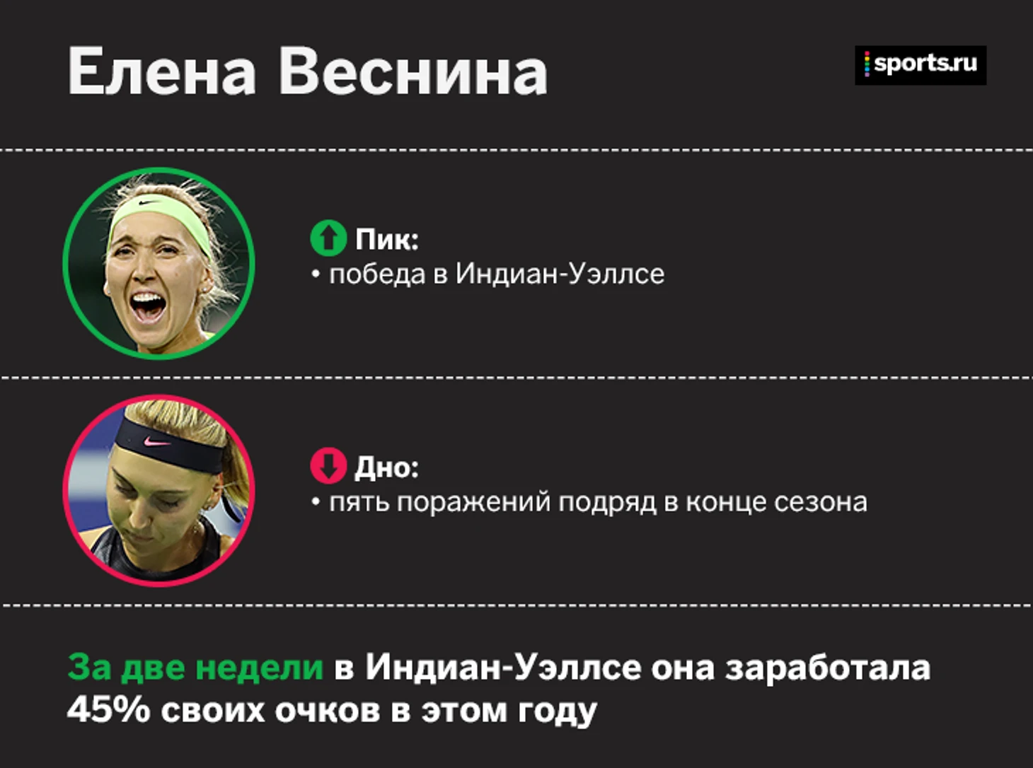 После главной победы в одиночной карьере Веснина ни на одном из турниров не дошла даже до четвертьфинала.