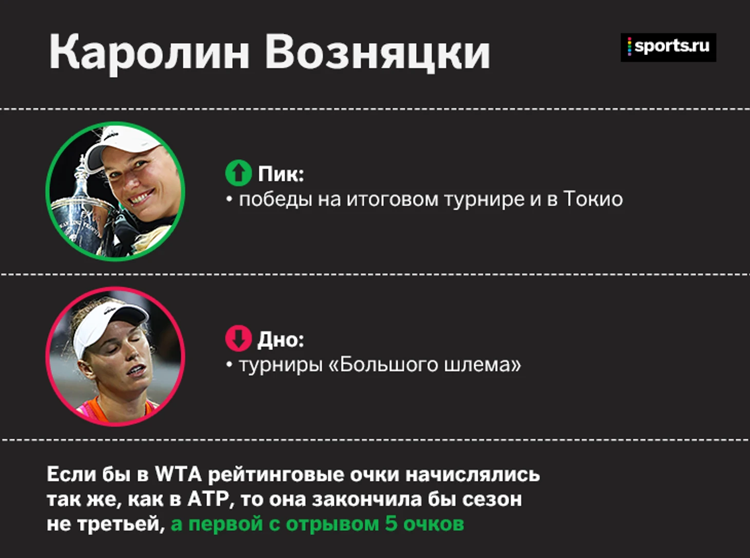 Датчанка была самой стабильной теннисисткой сезона. Проблема только в том, что из восьми финалов она проиграла шесть, а на «Больших шлемах» не проходила дальше четвертьфинала.