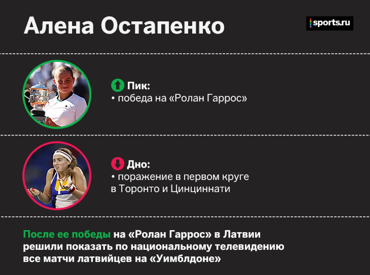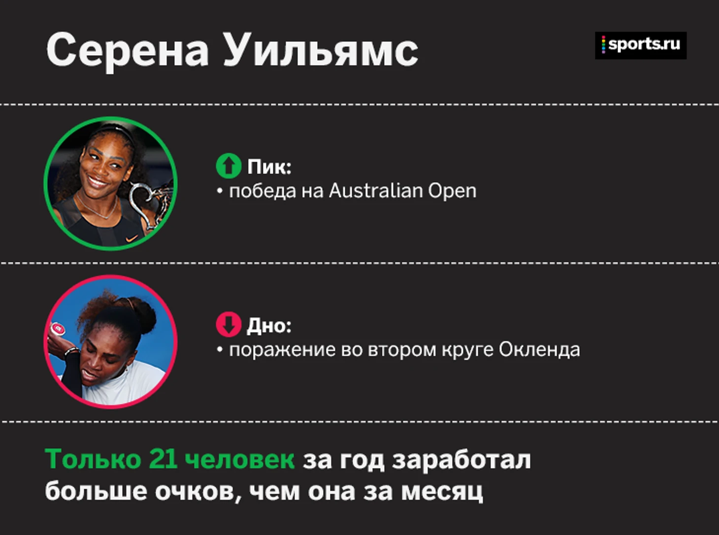 А еще в этом сезоне было две первых ракетки мира, которые на крупнейших турнирах не побеждали. Анжелик Кербер начала год лидером рейтинга, но закончила за пределами Топ-20. А Каролина Плишкова выигрывала только титулы среднего уровня.