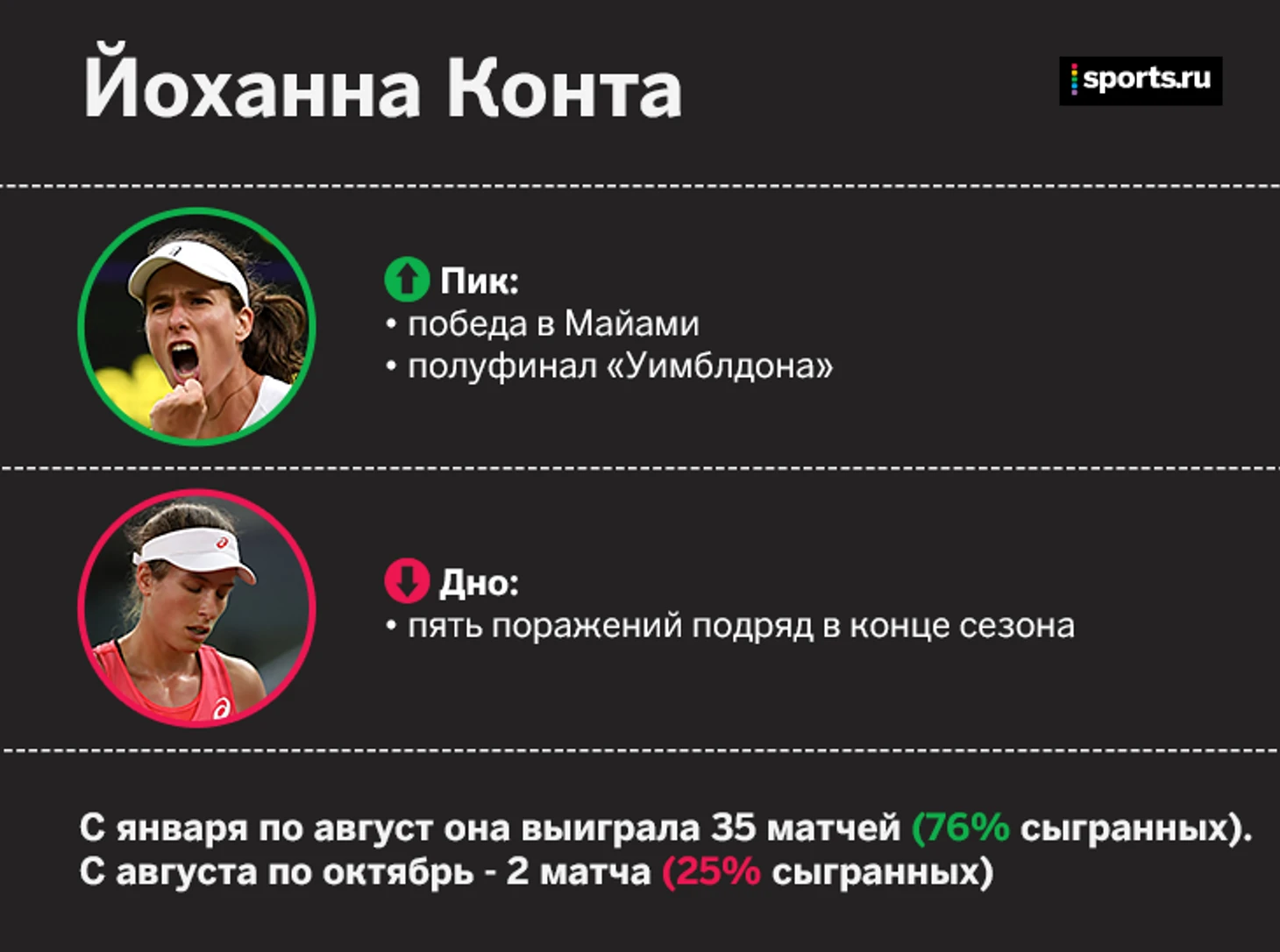 Конта проводила отличный сезон, но лето в Северной Америке стало провальным. Британка проиграла шесть матчей из восьми, включая пять подряд в конце сезона. В итоге Конта в последнюю неделю года потеряла место на итоговом, досрочно начала межсезонье и рассталась с тренером.