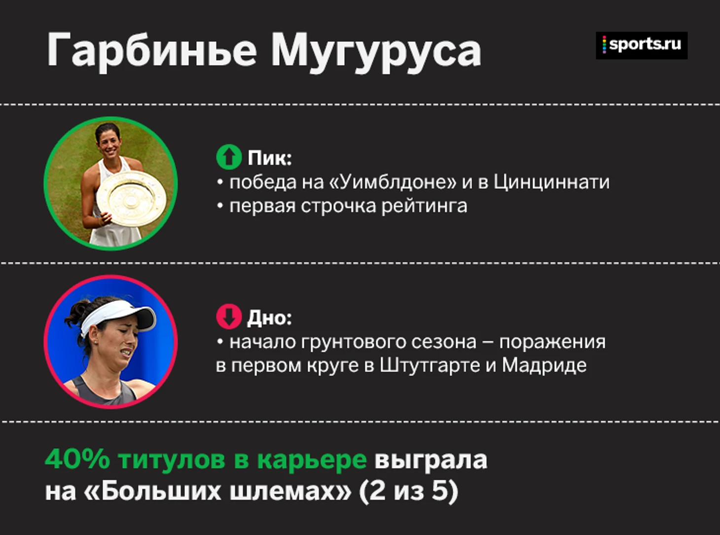 Испанка стала теннисисткой года по версии WTA, но на уровне своего звания играла всего два месяца – в июле и августе, когда выиграла «Уимблдон» и Цинциннати. Все остальное время она была не намного круче любой другой девушки из Топ-15.