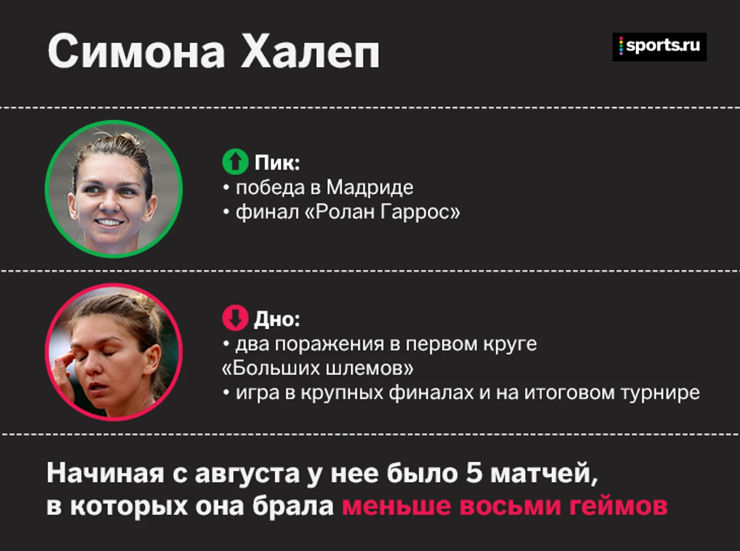 Первая ракетка мира Симона Халеп за весь год выиграла всего один титул. Во второй половине сезона она потерпела четыре разгромных поражения, потому что перегорала психологически. В звании первой ракетки румынка проиграла больше матчей, чем выиграла (1-2).