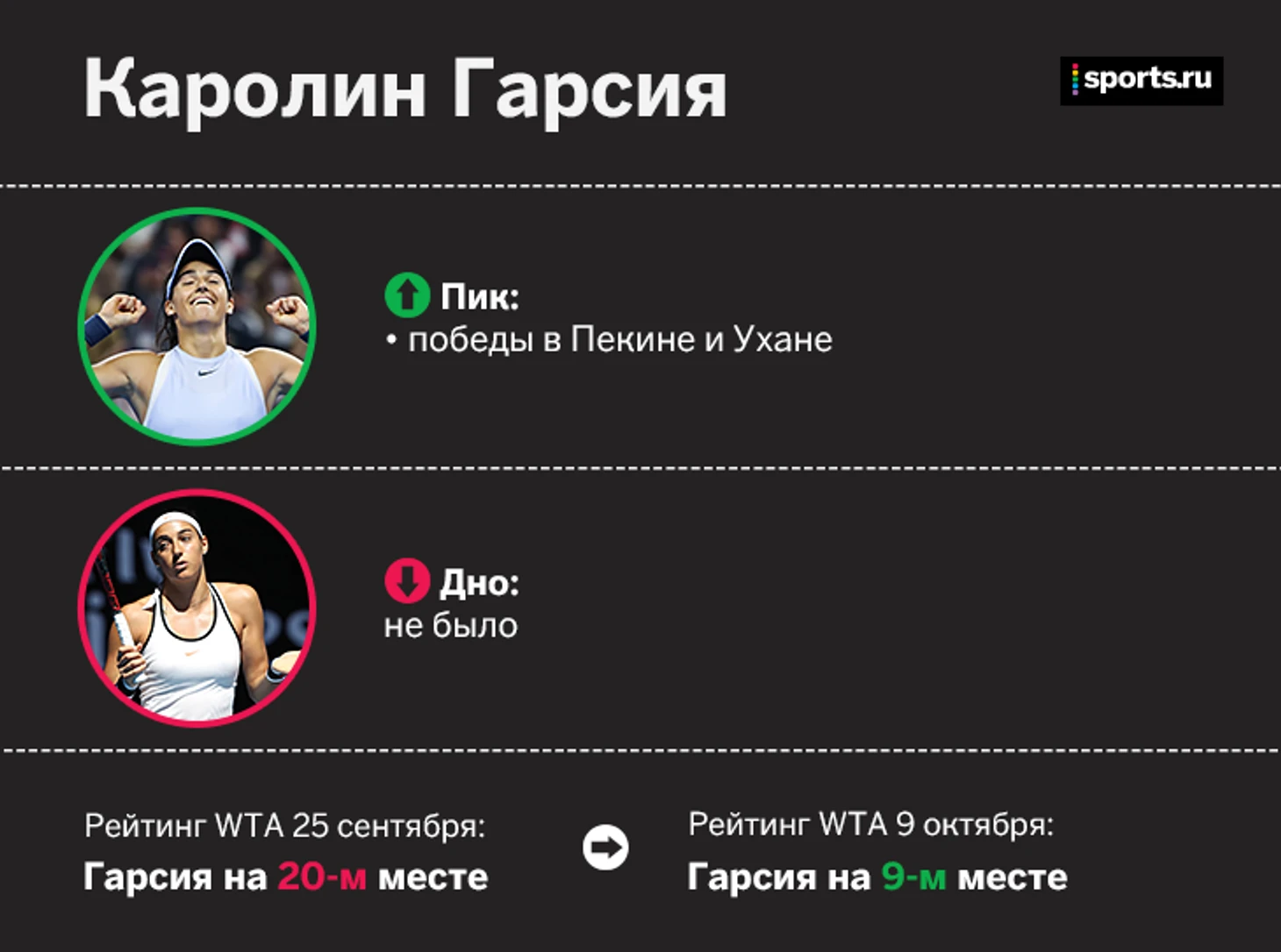 У Гарсии не было серьезных провалов, потому что весь сезон она играла не на уровне сверхэлиты. Она была обычной теннисисткой Топ-30. Но в конце года в Азии за три турнира Гарсия стала настоящей звездой. В Ухане и Пекине она последовательно выиграла крупнейшие титулы в карьере. За счет этого француженка попала в Топ-10, дебютировала на итоговом и там вышла в полуфинал.
