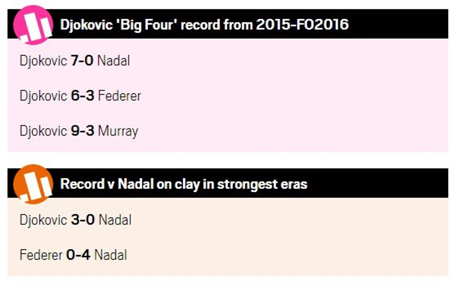 Но, возможно, наиболее убийственными для Федерера являются результаты Джоковича на грунте против Надаля – 10-кратного чемпиона Франции по теннису – и на траве против него самого – 8-кратного победителя Уимблдонского турнира.
