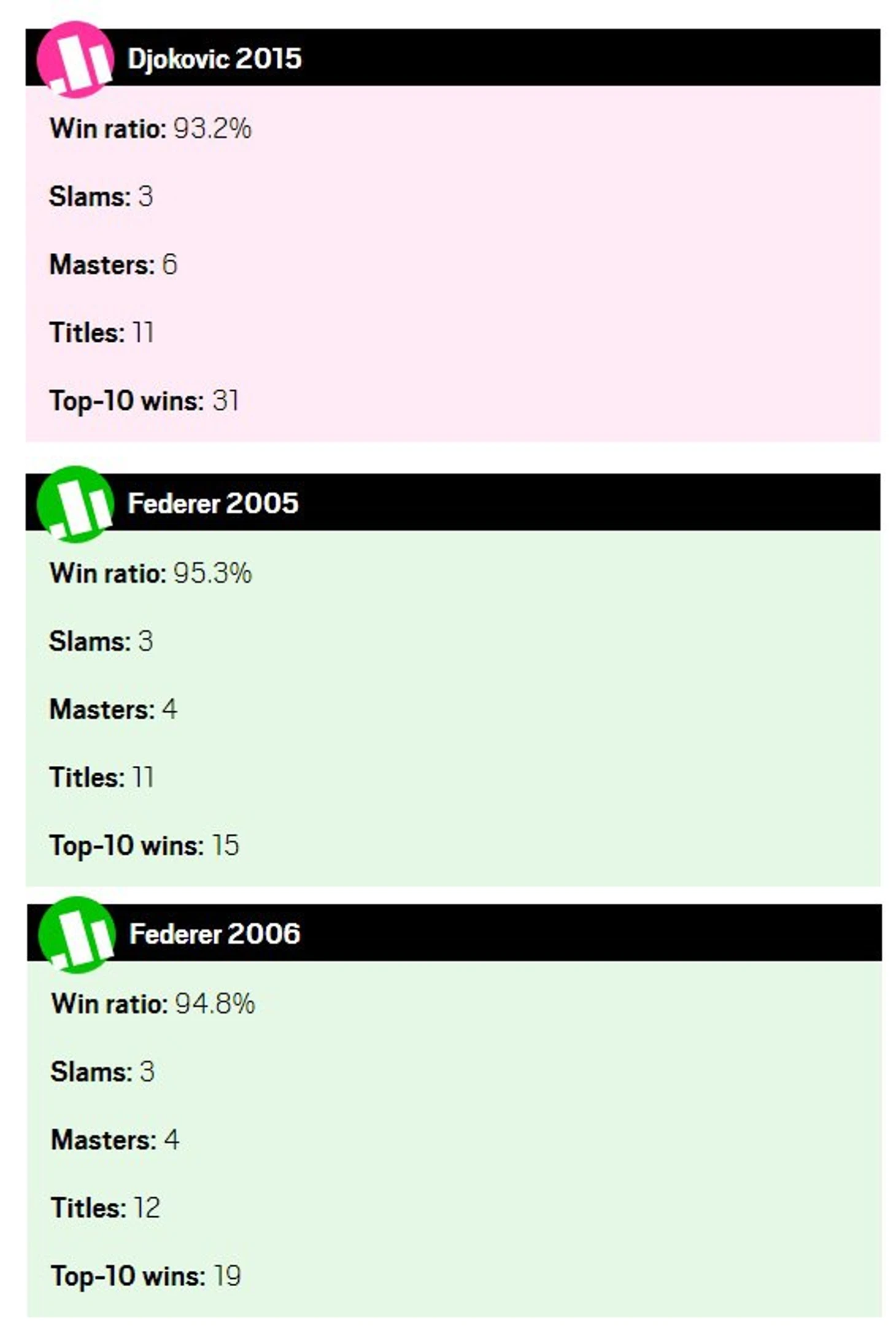 Статистика обоих в указанные периоды великолепна. У Федерера чуть выше процент выигранных матчей, однако Джокович обыграл 31 теннисиста топ-10 в 2015 году, а Федерер - лишь 19 в 2006 и 15 в 2005.
