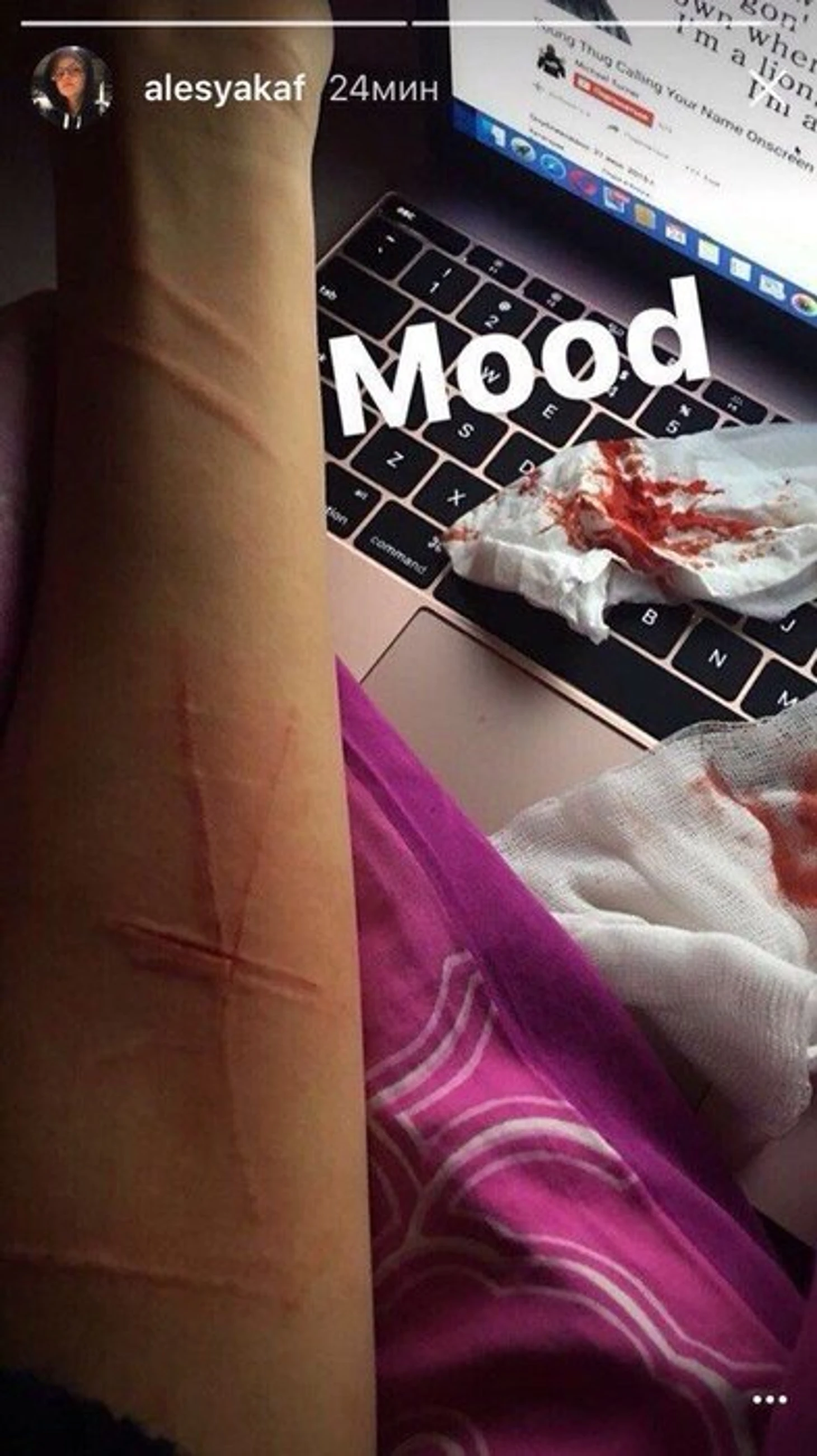 Алеся рассказала, что в то время в пансионе познакомилась с девушкой, которая тоже ходила одна и всегда носила кофту с длинными рукавами, – как потом оказалось, они были нужны, чтобы скрыть шрамы от порезов на руках. Кафельникова впервые порезала руку после обиды на Фату: «Разобрала точилку, осознанно, медленно, вытащила лезвие – и провела им по коже. Я получила то, что хотела: освобождение от боли через наказание самой себя. Это было как приход – только рукам очень холодно». Алесю отправили к психологу. Но резать руки она не прекратила. Год назад девушка выкладывала фото с порезанными венами, запачканной кровью салфеткой и надписью «Mood» (настроение).