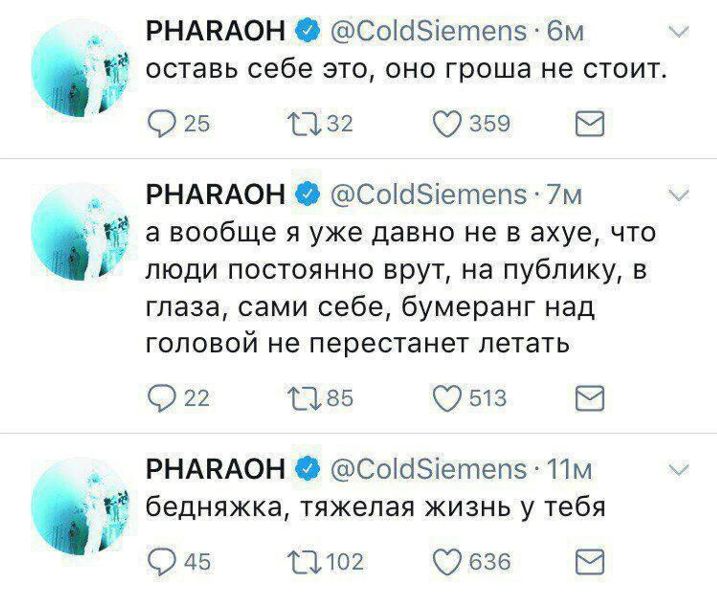 После выхода интервью Кафельниковой журналу Tatler Фараон написал серию твитов – вероятно, в ответ бывшей девушке.