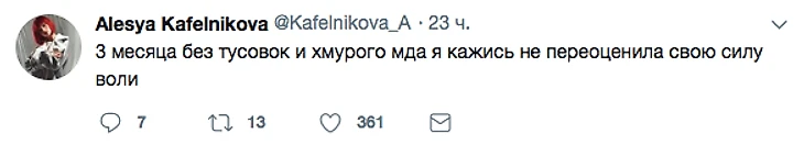 С августа по октябрь Алеся находилась на лечении и не обновляла соцсети. В начале декабря опубликовала твит: «3 месяца без тусовок и хмурого (на слэнге означает героин – Sports.ru) мда я кажись не переоценила свою силу воли». Позже девушка удалила запись.