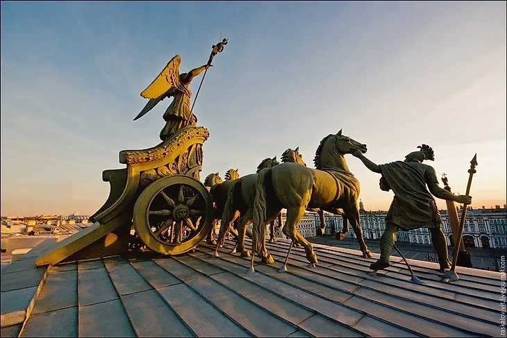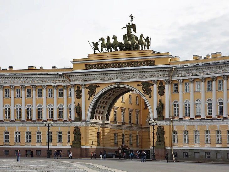 На Дворцовой площади - восхититься зданием Главного штаба с будто бы парящей над аркой и городом богиней Никой -