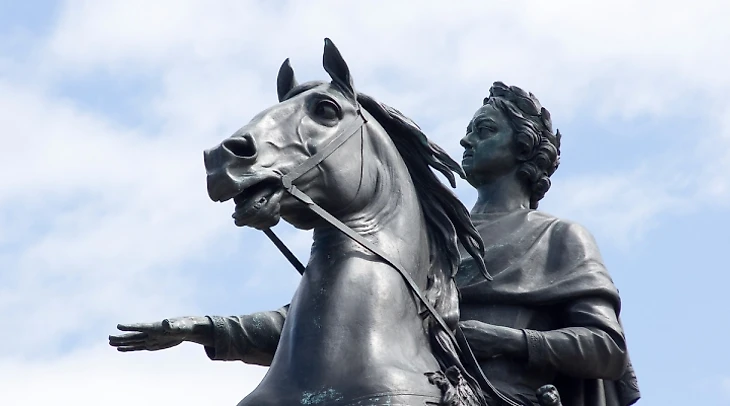 на триумфальной колеснице, запряженной шестёркой коней, удерживаемых двумя воинами в римских доспехах -