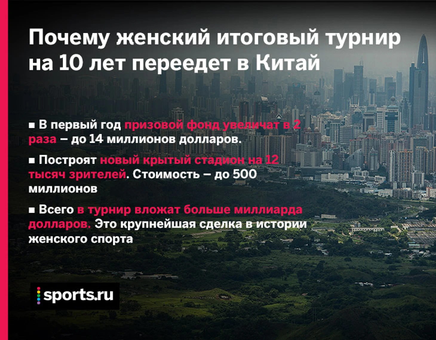 В самый разгар первой недели Australian Open Женская теннисная ассоциация (WTA) объявила, что с 2019 года итоговый турнир на 10 лет уедет в Шэньчжэнь. Китайский город выиграл борьбу у Санкт-Петербурга, Праги, Манчестера и Сингапура, где итоговый проходит сейчас.