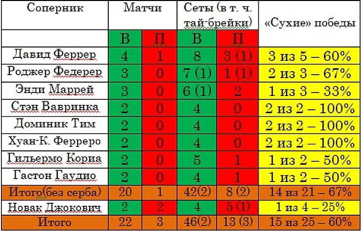 Это доминирование становится ещё более убедительным, если взглянуть на счёт личных встреч Надаля с другими сильными грунтовиками. В следующей таблице отражена статистика испанца на этом турнире с момента его дебюта в топ-100 против всех финалистов РГ, с которыми он сыграл хотя бы один раз. Также добавлен будущий финалист French Open – австриец Доминик Тим.