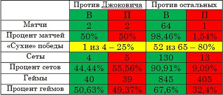 Из этой таблицы становится очевидным не только то, что Джокович победил Надаля вдвое больше раз, чем все его остальные соперники, вместе взятые, и тем самым является на порядок более опасным – и, по сути, единственным серьёзным – противником Рафы. По этой таблице видно, что противостояние Джоковича и Надаля в Монте-Карло абсолютно равное: каждый из них выиграл по 50% матчей и поровну геймов (с точностью до статистической погрешности), а по сетам минимальное преимущество серба за счёт везения в «теннисной лотерее».