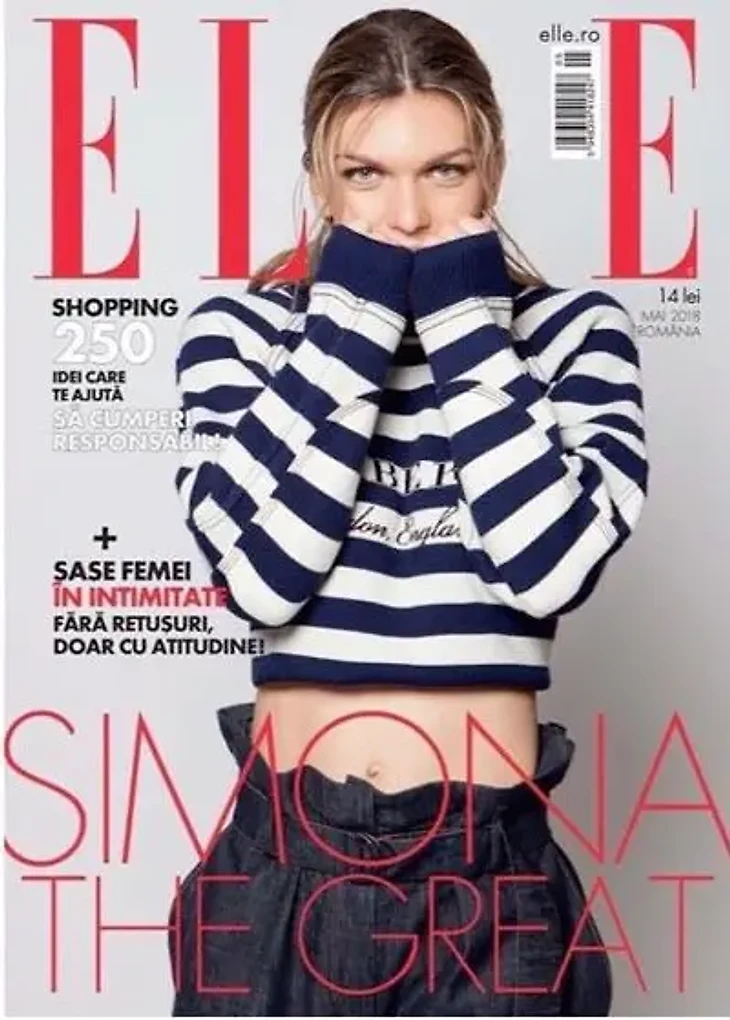 Первый номер рейтинга WTA, Симона Халеп, украсила обложку майского журнала Elle Romania, одевшись в полосатый свитер Burberry с капюшоном и брюки Brunello Cucinelli с набедренной сумочкой.