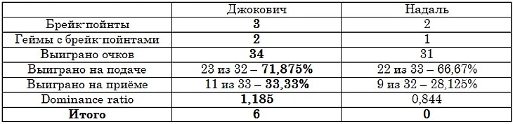 В теннисном сообществе тай-брейки общепризнанно считаются лотереями, хотя и находятся отдельные личности, утверждающие, что результат 13-го гейма зависит в большей степени от мастерства, чем от удачи. По их мнению, тай-брейки выигрывает тот, кто лучше играл в течение партии. Данный матч хорошо опровергает эту гипотезу: в «основное время» первого сета Джокович превзошёл Надаля по всем статистическим показателям. Рассмотрим их более подробно в нижеприведённой таблице.