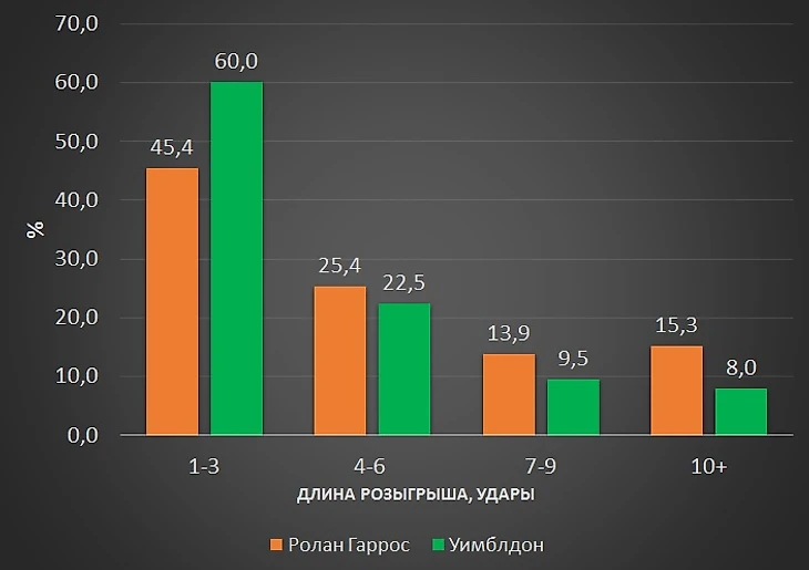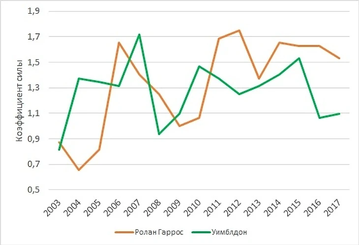 На рисунке 2 представлено сравнение "силы" Ролан Гаррос и Уимблдона в период 2003-2017. Лишь в 5 сезонах из 15 высокорейтинговые теннисисты выступали на травяном "Мейджоре" лучше, чем на грунтовом, а в текущем десятилетии Уимблдон неизменно уступает Ролан Гаррос. Беспроигрышная серия Франции достигла уже семи лет.
