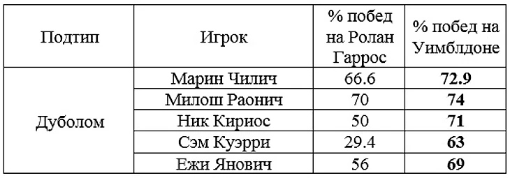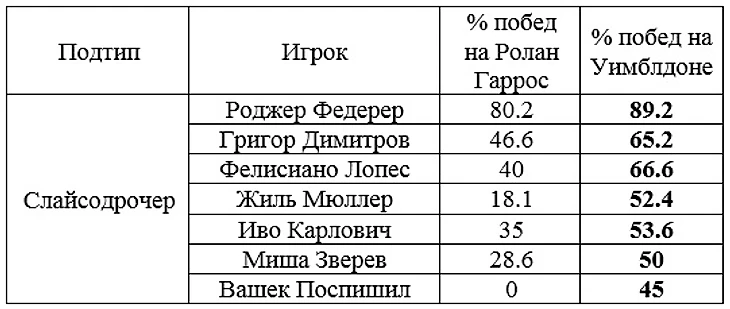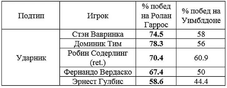Определив главные игровые качества, приводящие к успеху на двух противоположных покрытиях, можно создать мини-типологию ведущих игроков АТП на основе их успешности на грунте и траве.