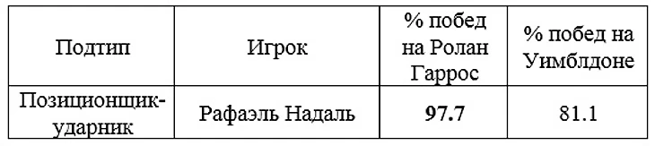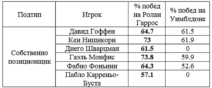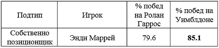 Подтип 3. Позиционщик-ударник. Данный феномен сочетает первые 3 свойства собственно позиционщика и наличие пробивной мощи. Его можно назвать идеальным теннисистом на грунте без слабых мест.