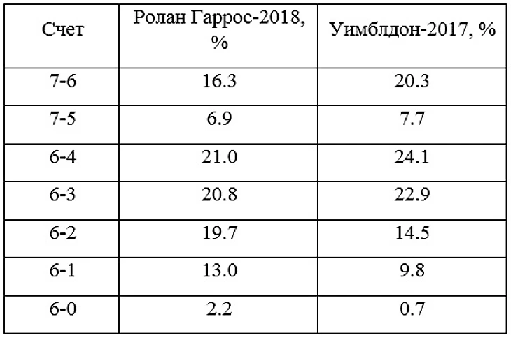 Зеленый газон в наименьшей степени позволяет спортсмену играть в теннис, то есть использовать разные по позиции нанесения, скорости, направлению, длине и вращению удары. У заведомо более сильного теннисиста на траве минимум возможностей продемонстрировать свое превосходство над оппонентом в общем уровне игры. Если противник просто хорошо подает и не делает глупостей со второго удара, будет крайне сложно не позволить ему дойти до тайбрейка, который общепризнанно считается теннисной лотереей, где фактор везения играет первостепенную роль. Если же теннисист допускает небольшой провал в игре на своей подаче, позволяя сопернику сделать брейк, его преимущество по игре в теннис на длинной дистанции не будет иметь никакого значения просто потому, что оппонент, эффективно используя игровую схему "подача-добивание", не даст нормально поиграть на приеме и вернуть потерянную подачу. На грунте, напротив, из двух игроков побеждает тот, кто лучше по игре в целом. При весомой разнице в мастерстве между соперниками неизбежен разгромный счет, включая "теннисные баранки". Процентное соотношение партий с разными счетом на последнем Ролан Гаррос и Уимблдоне продемонстрировано в таблице 1.