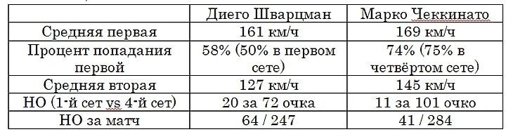 Из таблицы явно следует, что Чеккинато намного лучше подавал как по точности, так и по силе – особенно впечатляюще выглядит разница на втором мяче. Также его игра была намного чище, т. е. он не срывал столько же ударов, что и аргентинец. (Строго говоря, в общем случае нельзя сделать вывод о точности лишь по числу невынужденных и количеству розыгрышей, так как средняя длина розыгрышей в матчах может существенно отличаться, однако к этим поединкам последнее не относится: среднее количество ударов в розыгрышах матча Джокович – Чеккинато примерно равно среднему количеству ударов в матче Шварцман – Надаль и, возможно, даже несколько выше). Особенно поражает соотношение в четвёртом сете – 11 анфорсов за 101 розыгрыш! Более того, в решающий момент – начиная со счёта 4:4 на тай-брейке – итальянец не допустил вообще ни одной невынужденной ошибки за следующие 16 розыгрышей, из которых выиграл 9. В то же время для того, чтобы обыграть Рафу 6-4, от Шварцмана не потребовалось «чистой» игры – 20 розыгрышей (большинство из которых недлинные) из 72 завершились его невынужденными ошибками.